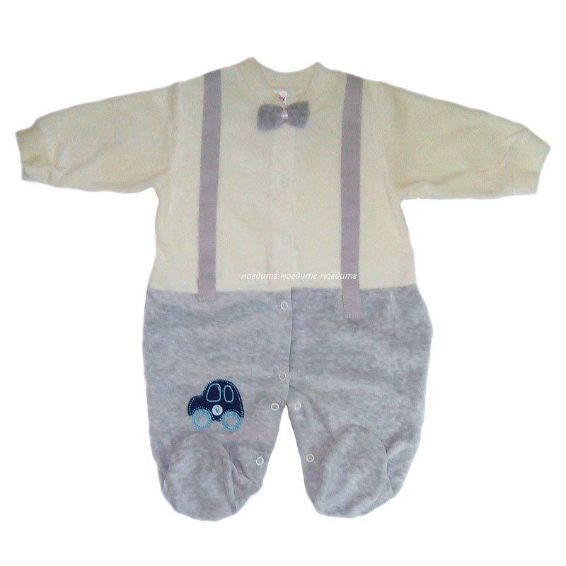 Комбинезон для мальчиков из велюра, с закрытыми ножками, с длинным рукавом на манжете, без воротничка, спереди и между ножек на кнопочках. Украшен имитацией подтяжек и пришитой "бабочкой". Верх молочного цвета, штанишки серого цвета.